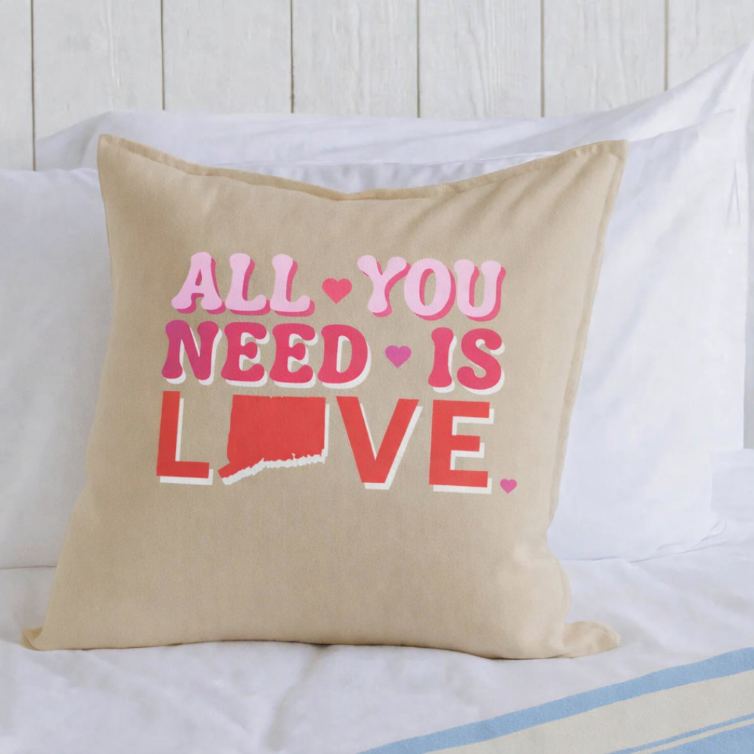 Our CT Love Pillow is a cozy way to celebrate love, local pride, and Valentine’s Day at home. Featuring our limited edition “All You Need Is Love” design, this pillow makes the perfect Connecticut Valentine’s gift for dorm rooms, first apartments, or any living room that could use a little love!