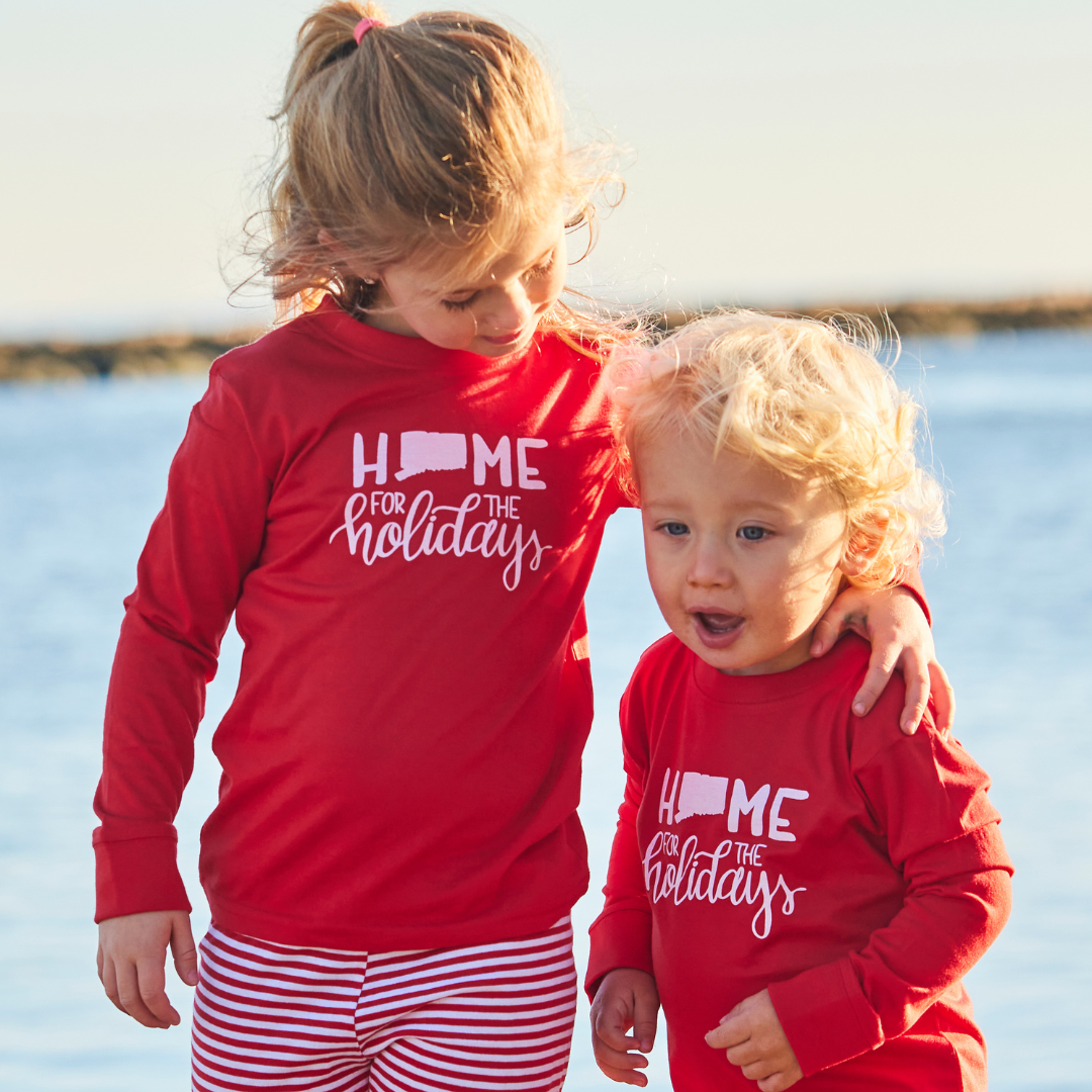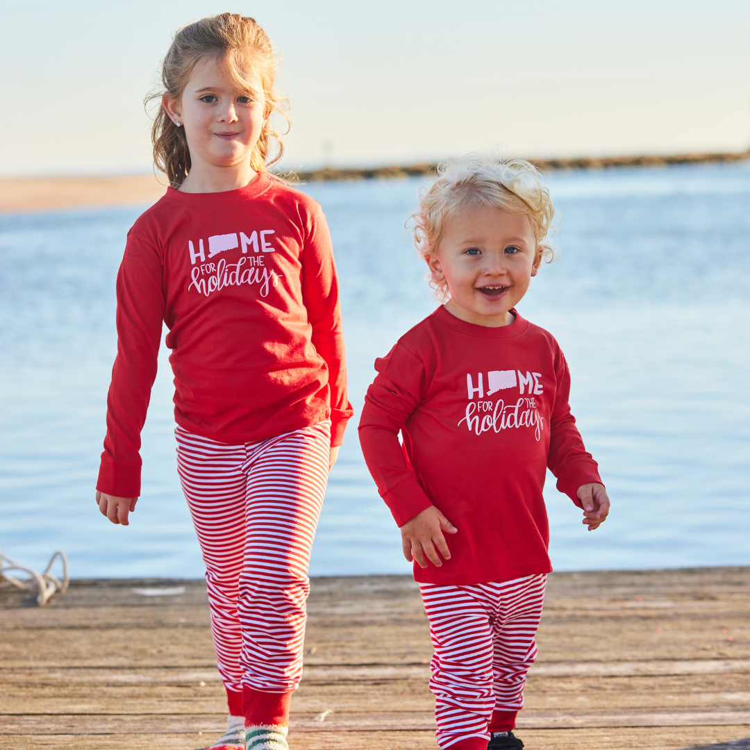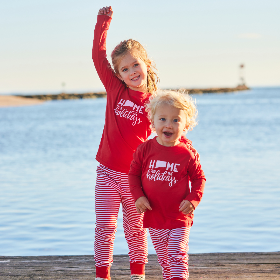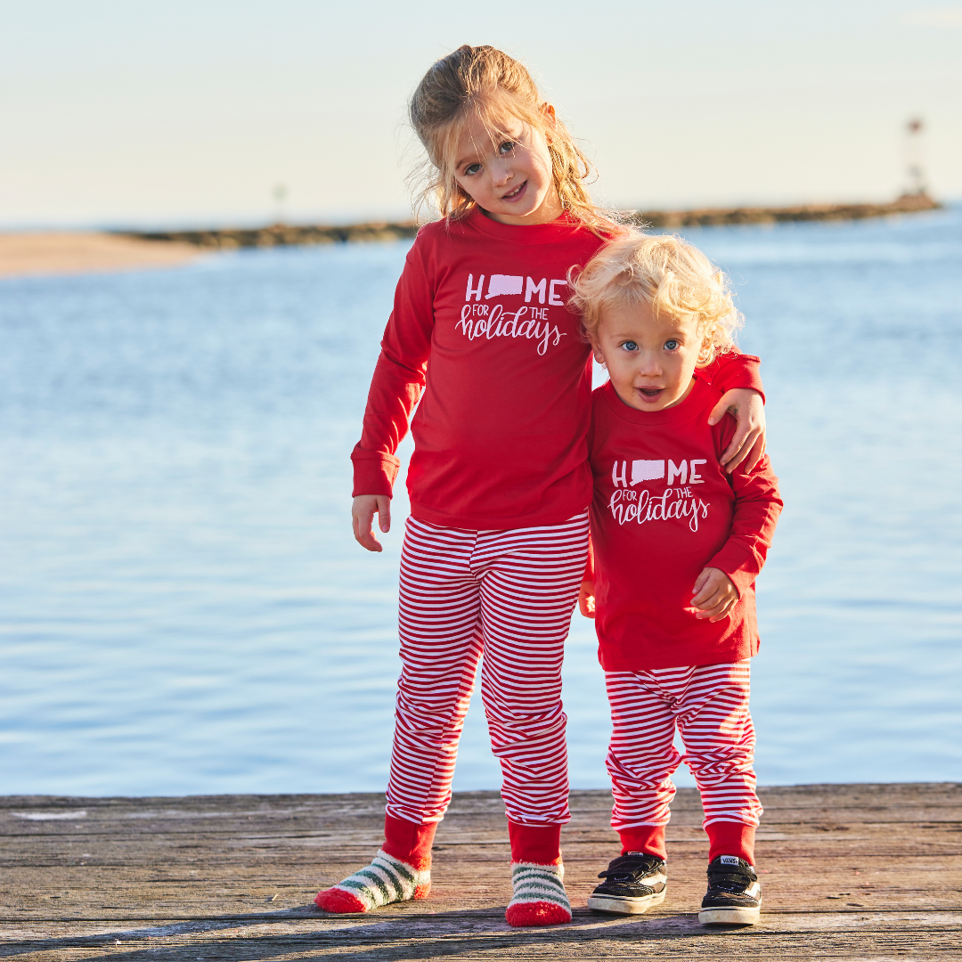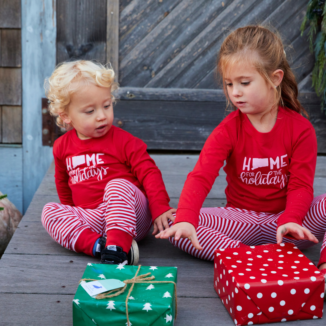 Wrap Them in Connecticut Cheer! Made from an ultra-soft cotton blend, these festive PJs are as comfortable as they are adorable. The long-sleeve top features our exclusive Connecticut-themed Home for the Holidays design, perfectly paired with cheerful red-and-white striped pants.
