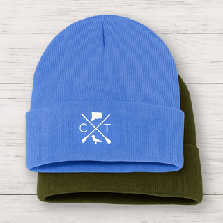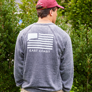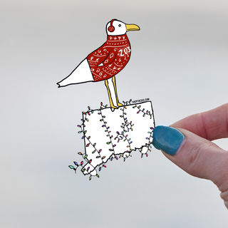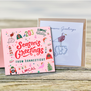 A round ceramic holiday ornament with a 'Season's Greetings from Connecticut' text, featuring holiday-themed illustrations in red, green, and yellow colors, hanging on a Christmas tree.