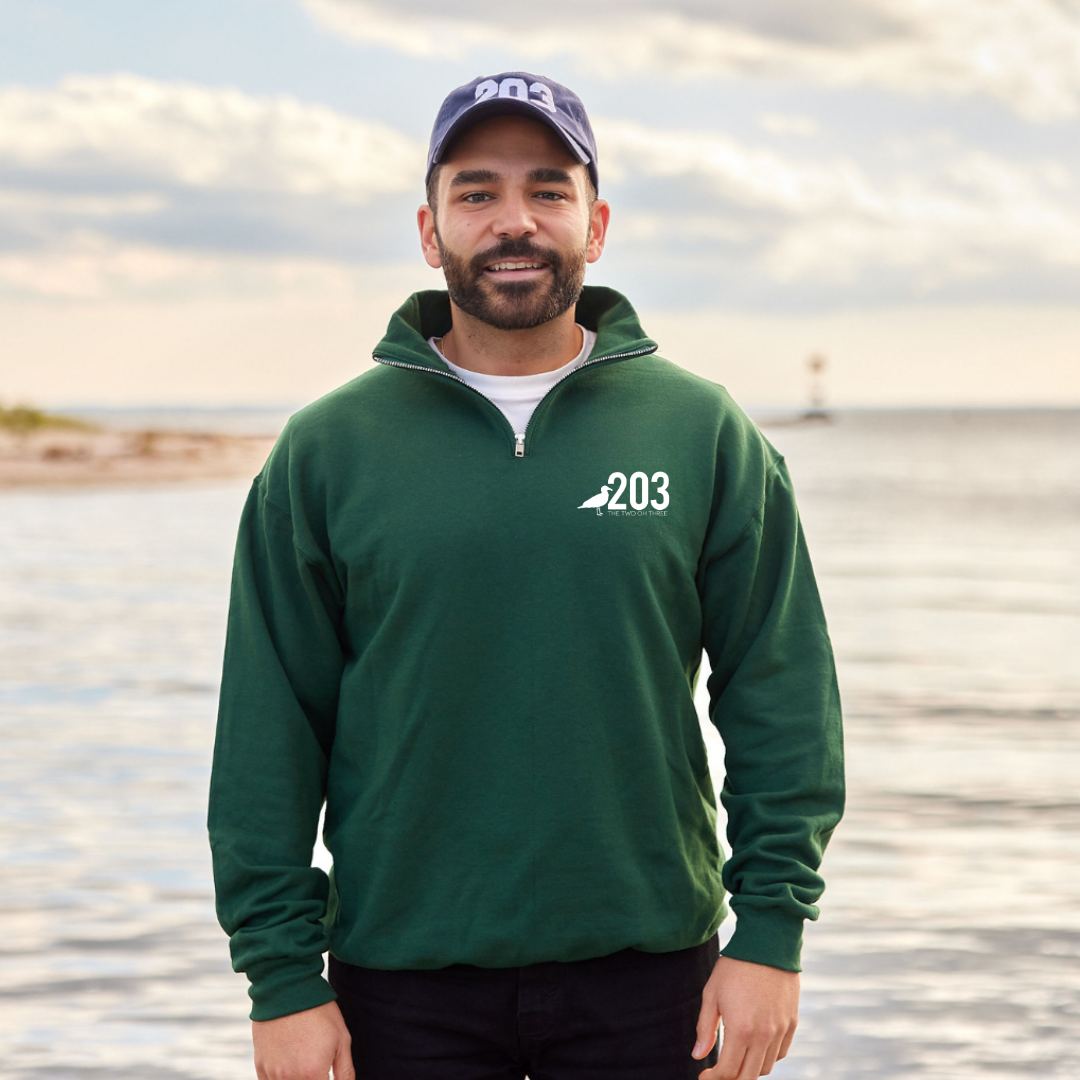 The Classic 203 Home Quarter Zip in hunter green is a timeless staple made for CT Locals. Featuring our iconic 203 design on the front and CT Home on the back in crisp white, this pullover is equal parts classic and versatile. Soft, durable, and built to last, it’s perfect for layering, dressing up, or everyday comfort.